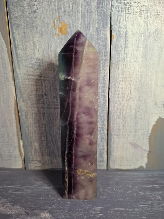 Rainbow Fluorite tower with druzy, measuring approx 188mm x 43mm. Fluorite is found in a large variety of colours, due to the impurities in the crystal, and can be found in cubic form, octahedrons and large pieces without crystal structure visible to the naked eye. When Fluorite is pure it is colourless and many varieties are fluorescent. You will receive the exact crystal shown.