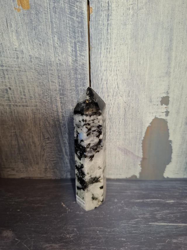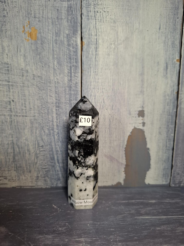 Rainbow Moonstone tower, measuring approx 87mm x 25mm. A white Feldspar, often found with flashes of colour, but not always. Colours range from mainly blue, but also golds, oranges and purples. Feldspar is a large group of minerals that includes Labradorite, Moonstone and Amazonite. You will receive the exact crystal shown.