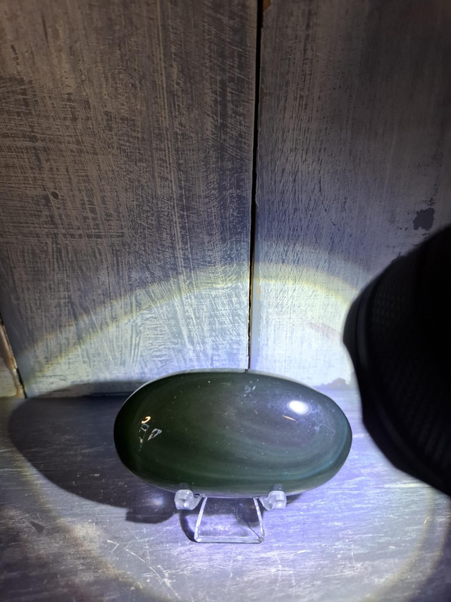 Rainbow Obsidian palmstone with green hues, measuring approx 65mm x 35mm. A natural variety of Obsidian that appears black in dull light, but in bright light has colours of greens, purples, pinks and greys. Obsidian is a natural volcanic glass formed after eruptions and comes in different varieties, with plain black being the most common.The use of Obsidian dates back to the Stone Age. It has been polished into mirrors for use in contacting Spirit and forged into weapons and tools. It has such a sharp edge that even today, surgical scalpels are made from it. You will receive the exact crystal shown.