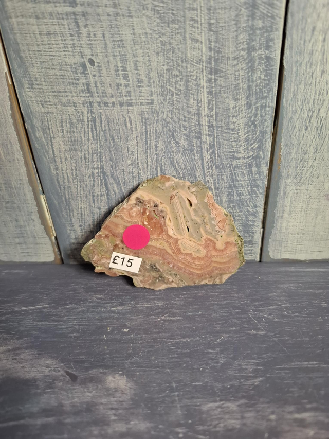 Rhodochrosite slice, measuring approx 63mm x 45mm. A rare pink/red crystal that gets its colour from manganese. It is the national gemstone of Argentina, which has the oldest Rhodochrosite mines in the world, dating back to 13th century. You will receive the exact crystal shown.
