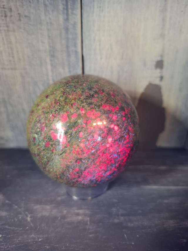 Ruby Fuchsite in Kyanite sphere, measuring approx 65mm. A rare combination of Ruby in both Fuchsite and Kyanite. Most commonly found in Southern India. The Ruby is uv reactive. You will receive the exact crystal shown.