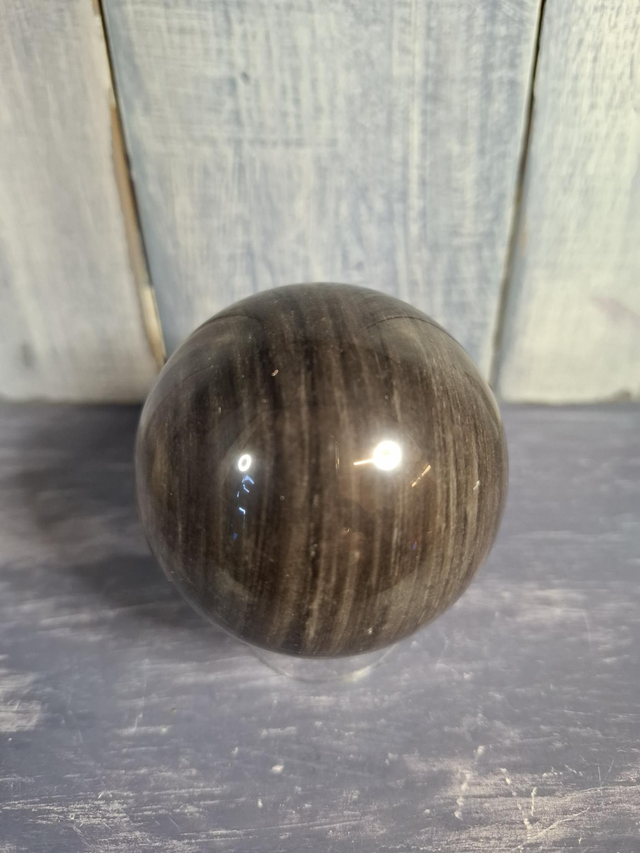 Silver Sheen Obsidian sphere, measuring approx 57mm. Silver Sheen Obsidian is a naturally occurring volcanic glass with a beautiful silver shimmer caused by internal gas bubbles and inclusions. Obsidian is a natural volcanic glass formed after eruptions and comes in different varieties, with plain black being the most common.The use of Obsidian dates back to the Stone Age. It has been polished into mirrors for use in contacting Spirit and forged into weapons and tools. It has such a sharp edge that even today, surgical scalpels are made from it. You will receive the exact crystal shown.