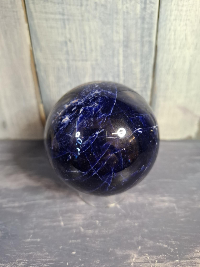 Deep blue Sodalite sphere, measuring approx 62mm. Sodalite is a rich blue tectosilicate mineral, often mixed with white Calcite veins. It is often confused with Lapis Lazuli, but rarely contains Pyrite.Officially discovered in 1806 in Greenland, but Peruvians traded Sodalite as far back as 2600 BC. You will receive the exact crystal shown.