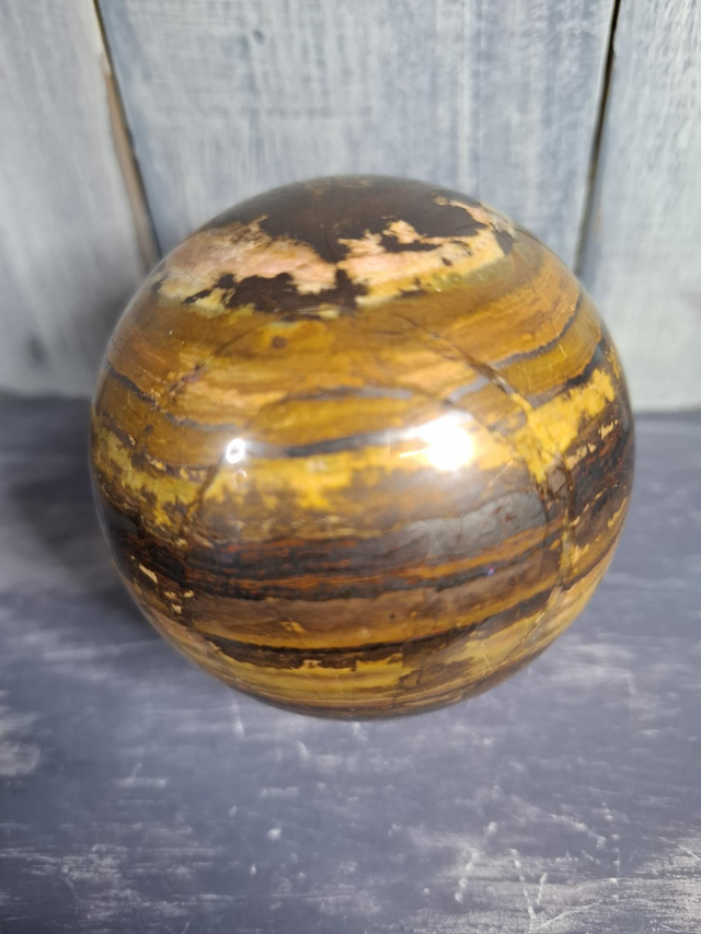 Tiger Iron sphere, measuring approx 66mm. A naturally occurring mix of Tiger's Eye, Hematite and Red Jasper. You will receive the exact crystal shown.
