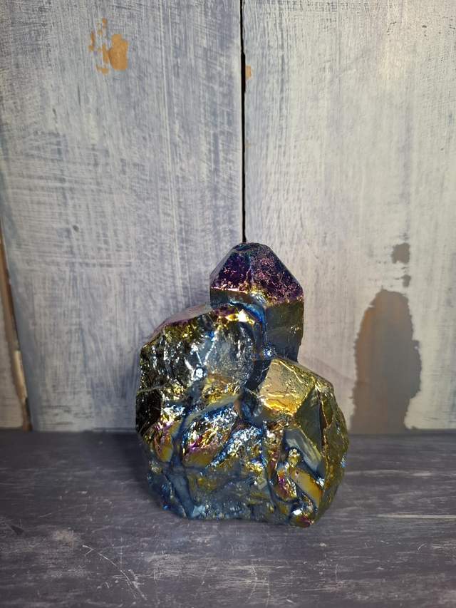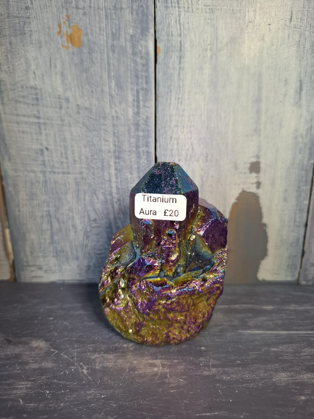 Titanium Aura Quartz Cluster, measuring approx 80mm x 59mm. Clear Quartz bonded with Titanium Oxide to get the aura colour and flash. You will receive the exact crystal shown.