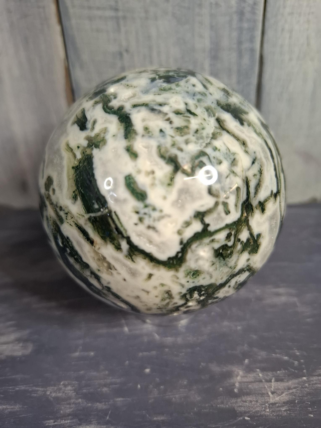 Tree Agate sphere, measuring approx 75mm. A similar composition to Moss Agate, but has a milky, cloudy Quartz base. You will receive the exact crystal shown.