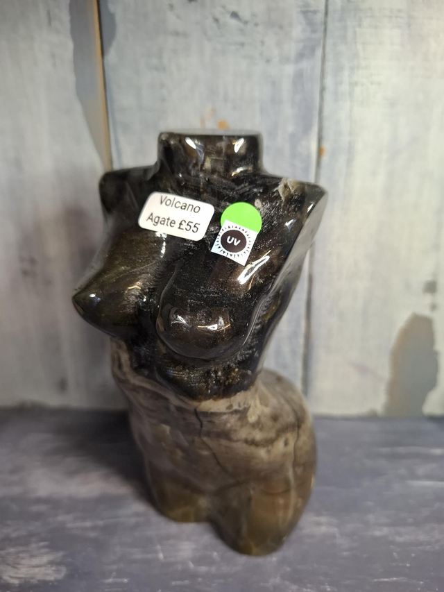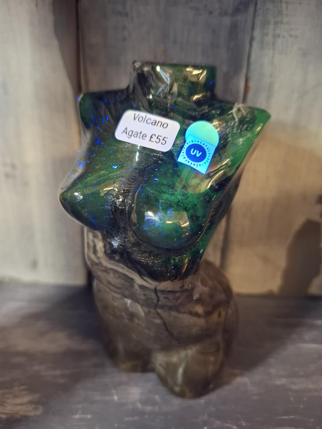 Volcano Agate lady body carving, uv reactive, measuring approx 140mm x 65mm. A Chalcedony that forms within volcanic rock cavities from silica-rich groundwater. Known for its vibrant green fluorescence under uv due to trace minerals.You will receive the exact crystal shown.