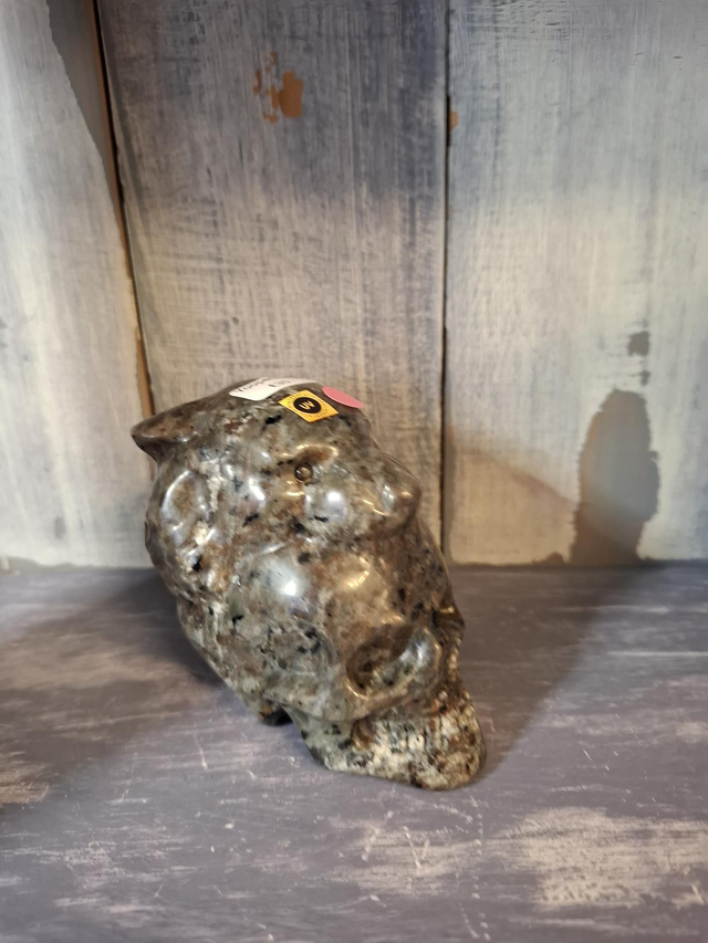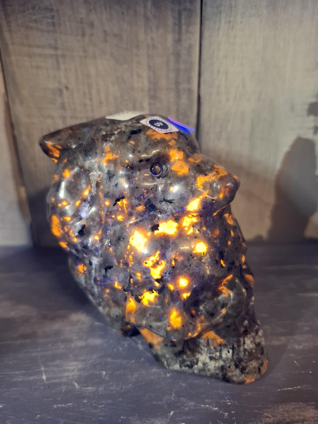 Yooperlite skull and wolf head carving, with amazing uv reaction, measuring approx 70mm x 70mm. Yooperlite is a trade name give to Syenite rocks found around Lake Superior in 2017. They have an amazing uv reaction that has also given them the name 'Fire Stone'. Only Syenite from Michigan, Canada and be called Yooperlite. You will receive the exact crystal shown.