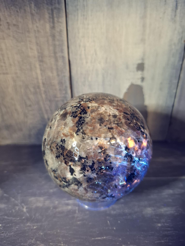 Yooperlite sphere, measuring approx 64mm. Yooperlite is a trade name give to Syenite rocks found around Lake Superior in 2017. They have an amazing uv reaction that has also given them the name 'Fire Stone'. Only Syenite from Michigan, Canada and be called Yooperlite. You will receive the exact crystal shown.